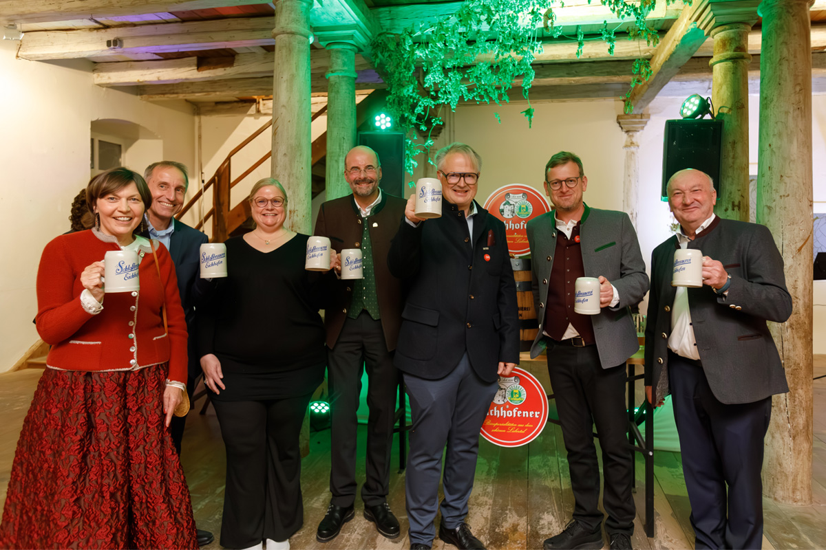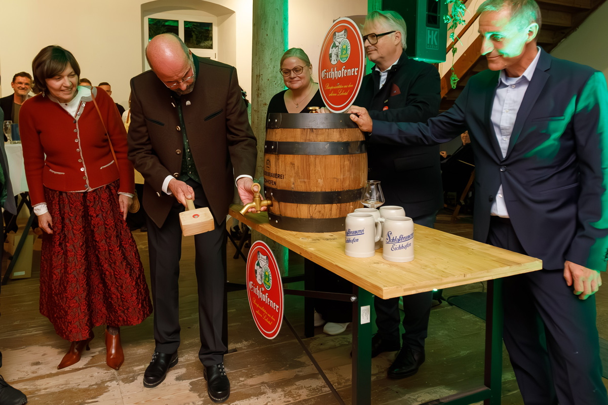 Im Mittelpunkt des Abends stand das feierliche Anzapfen des Jubiläumsbieres „1692“, das eigens zu diesem Anlass gebraut wurde. Mit schwungvollem Hammerschlag eröffnete Dr. Lothar Ebbertz, Hauptgeschäftsführer des Bayerischen Brauerbundes, das erste Fass. Unterstützt wurde er dabei von Thomas Ruhfaß und Christine Vogel von der Stadtmaus, den Hausherren Daniela und Michel-Andreas Schönharting, Braumeister Michael Trübswetter, Bürgermeister Helmut Sammüller sowie zahlreichen Mitgliedern des Eichhofener Brauerei-Teams.