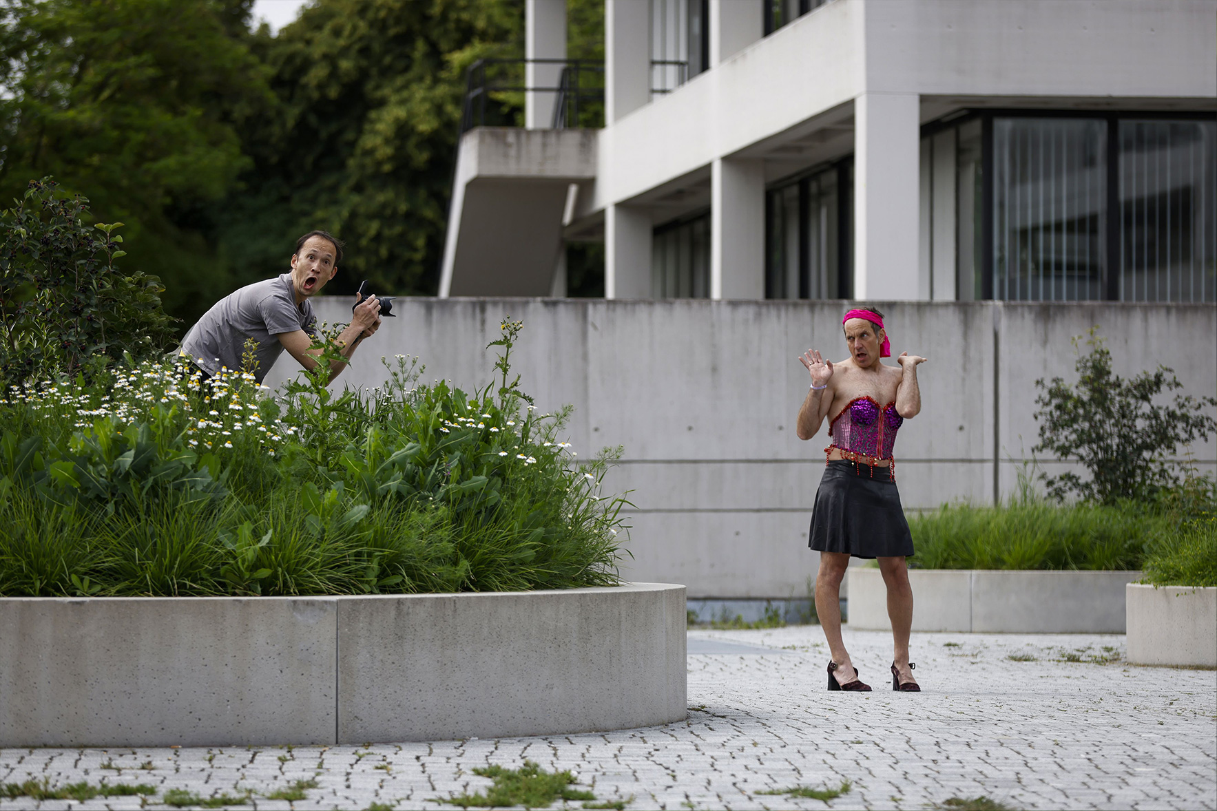 Tobias Ostermeier und Florian Toperngpong führen die BesucherInnen durch die Ausstellung – nicht mit klassischen kunsthistorischen Vorträgen, sondern mit improvisierten Szenen, pointierten Dialogen und überraschenden Perspektivwechseln. Dabei entstehen kleine Geschichten zwischen Blüte und Beton, Zwischenrufe der Werke selbst, absurde Begegnungen und leise poetische Momente. Mit theatralen Mitteln und Humor schaffen sie Aufmerksamkeit: für Formen, Stimmungen, Assoziationen – und für das, was Kunst im jeweiligen Moment auslösen kann.
